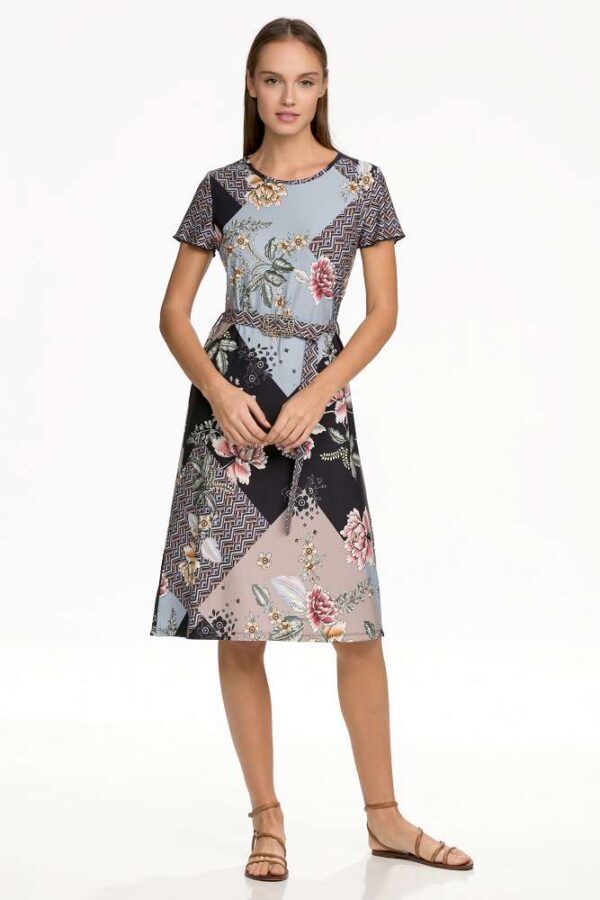 PRINTED SHORT SLEEVE DRESS WITH OVERLAYS