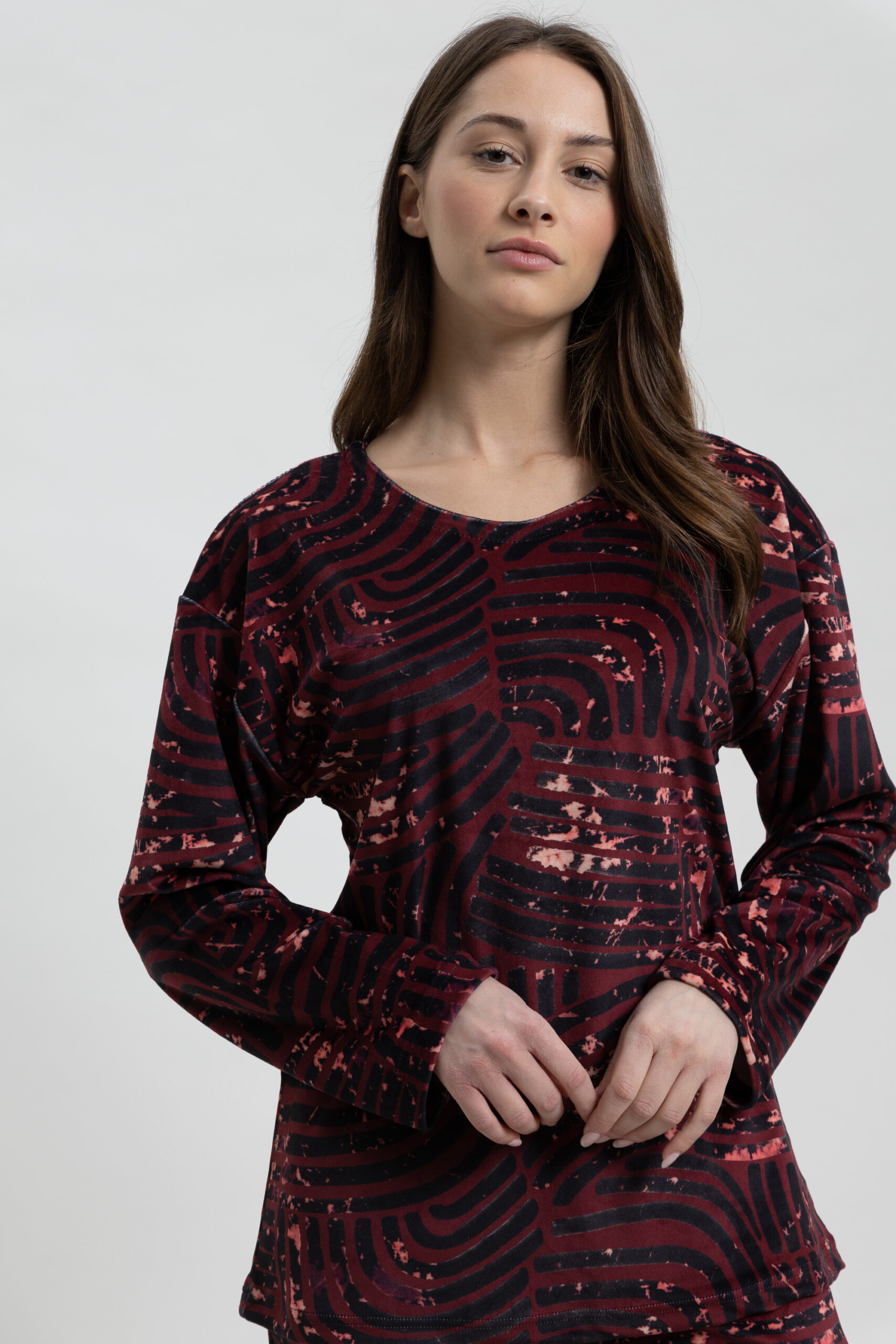 Πολυτέλεια και άνεση με μοντέρνο abstract σχεδιασμό. Γυναικείο σετ πυτζάμας από εξαιρετικά μαλακό βελουτέ ύφασμα σε βαθύ μπορντό χρώμα. Το σετ διακρίνεται για το μοναδικό abstract μοτίβο με μαύρες γραμμές και περιλαμβάνει μακρυμάνικη μπλούζα, παντελόνι με λάστιχο στο τελείωμα και ασορτί μάσκα ύπνου για την απόλυτη εμπειρία χαλάρωσης.