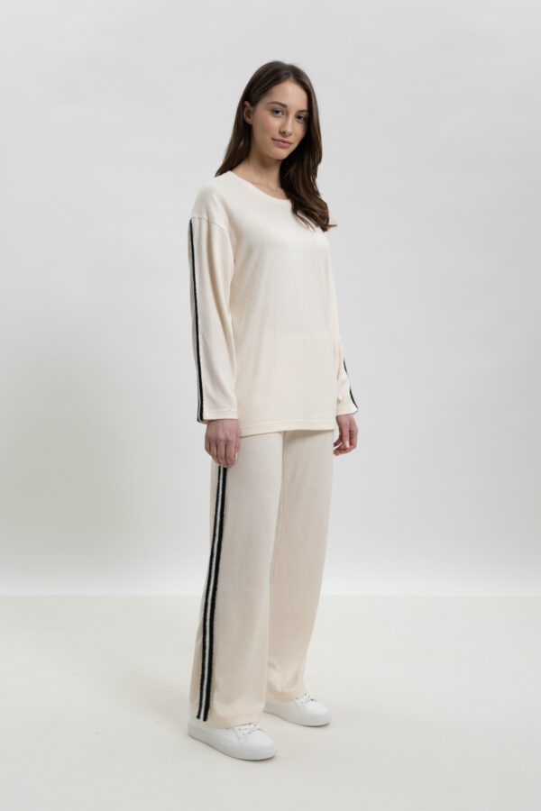 Μοντέρνα άνεση με καλλιτεχνική διάθεση. Ξεχωρίστε ακόμα και στις στιγμές χαλάρωσης με αυτό το γυναικείο σετ loungewear σε εκρού απόχρωση. Το σετ περιλαμβάνει μακρυμάνικη μπλούζα με εντυπωσιακό, μίνιμαλ abstract σχέδιο στο μπροστινό μέρος και ασορτί παντελόνα σε άνετη γραμμή. Η ιδανική επιλογή για ένα κομψό και ταυτόχρονα cozy look.