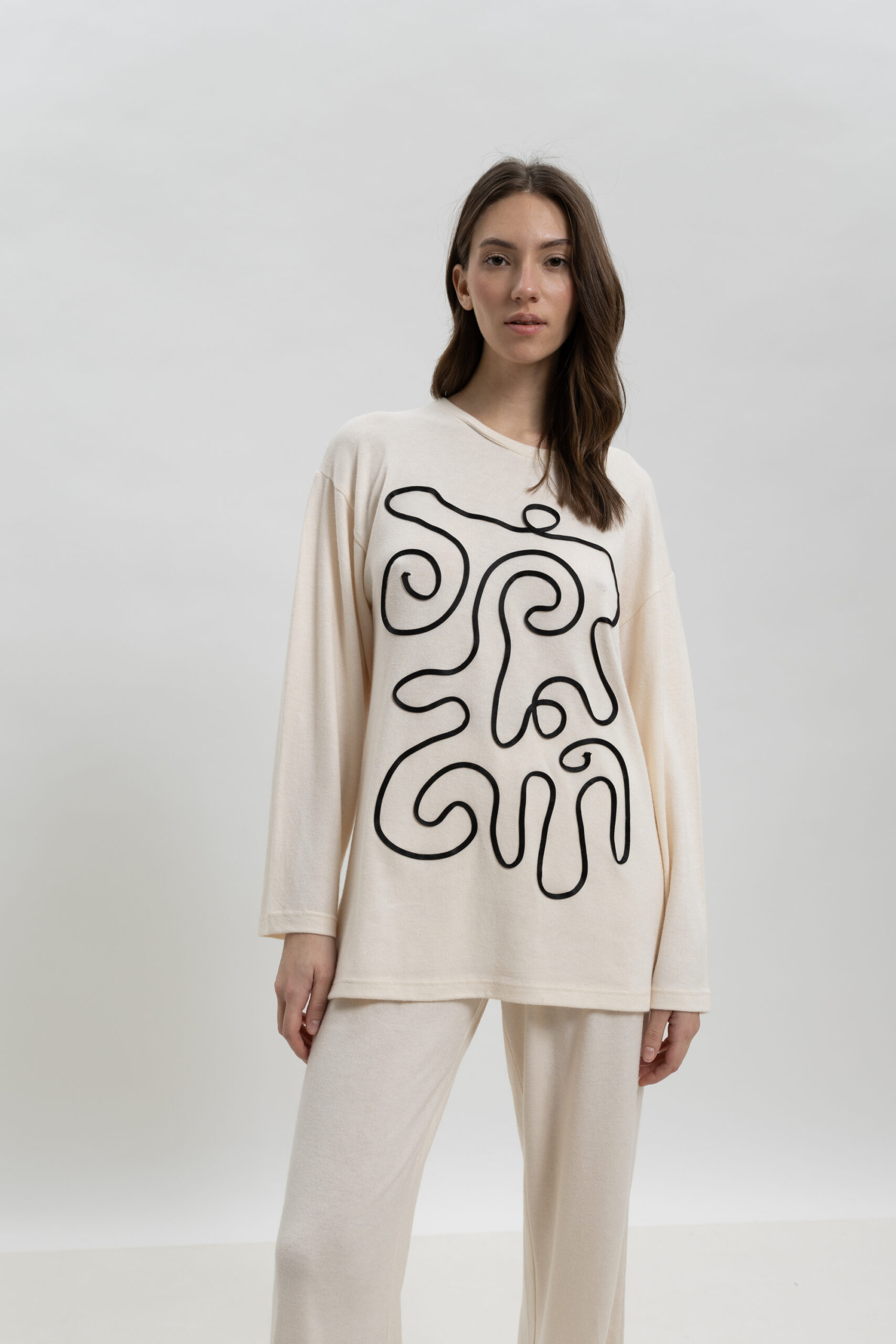 • Top: Μπλούζα με στρογγυλή λαιμόκοψη και εντυπωσιακή μαύρη γραμμική εκτύπωση (line art) που δημιουργεί μια δυναμική αντίθεση με το εκρού φόντο.