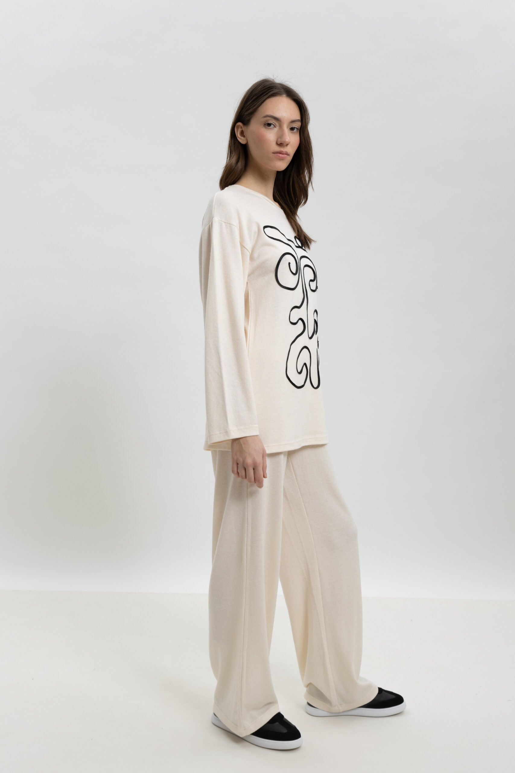 Μοντέρνα άνεση με καλλιτεχνική διάθεση. Ξεχωρίστε ακόμα και στις στιγμές χαλάρωσης με αυτό το γυναικείο σετ loungewear σε εκρού απόχρωση. Το σετ περιλαμβάνει μακρυμάνικη μπλούζα με εντυπωσιακό, μίνιμαλ abstract σχέδιο στο μπροστινό μέρος και ασορτί παντελόνα σε άνετη γραμμή. Η ιδανική επιλογή για ένα κομψό και ταυτόχρονα cozy look.