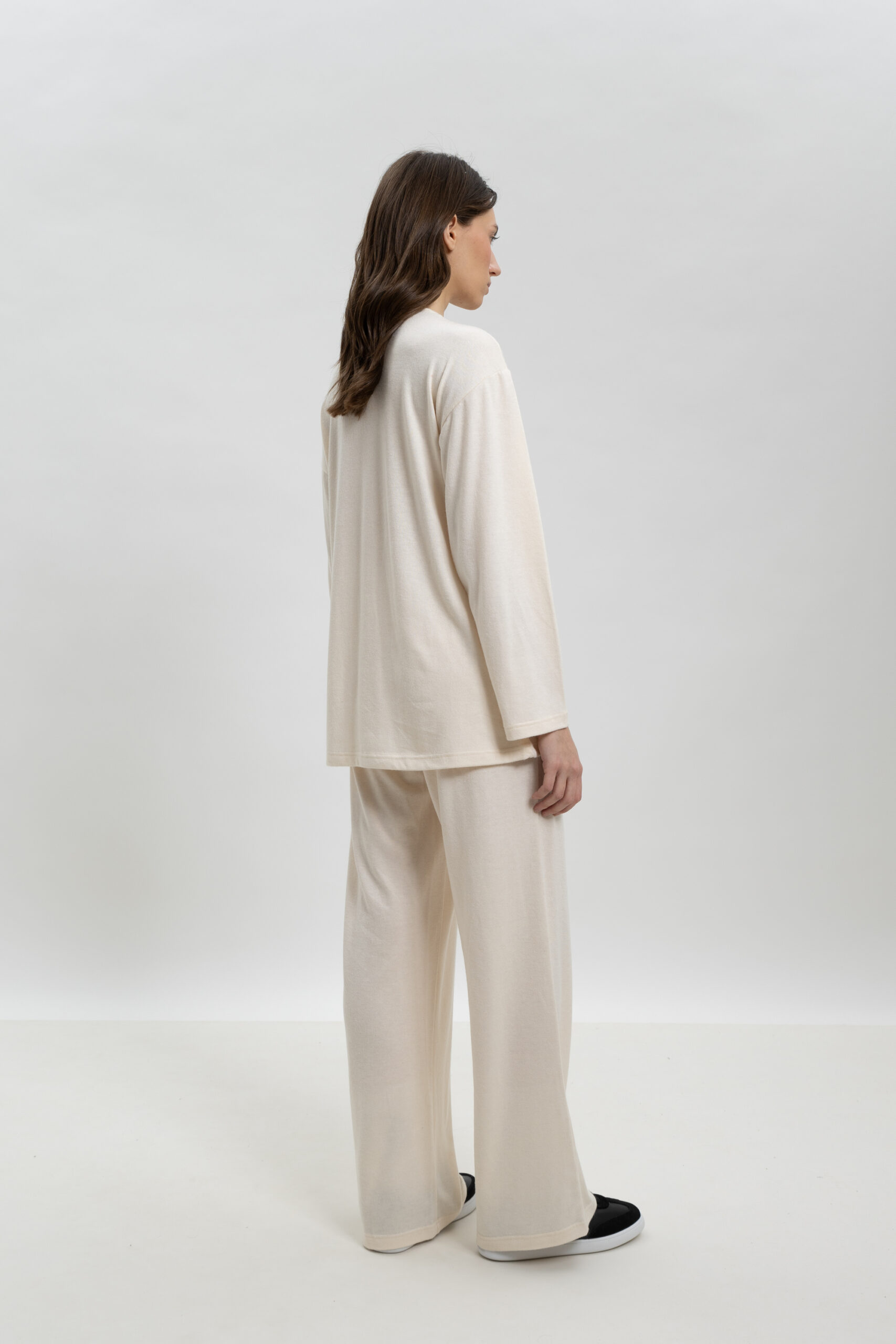 • Bottom: Παντελόνα σε loose γραμμή (wide leg) που προσφέρει απόλυτη ελευθερία κινήσεων και αέρινη αίσθηση.